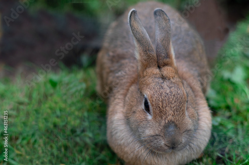 Fototapeta premium Close-up gray domestic rabbit on natural background, farm, domestic animals