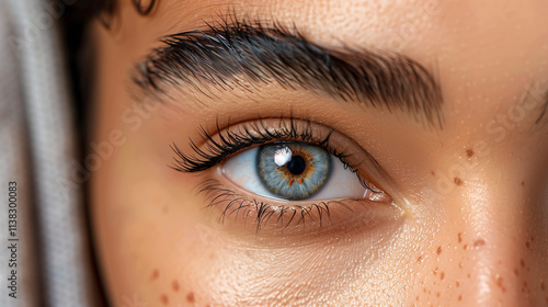 © Herseliia, Obraz premium Close-up gray eye Indian woman, beauty salon treatment, 2d volume, classical lashes, brows lamination