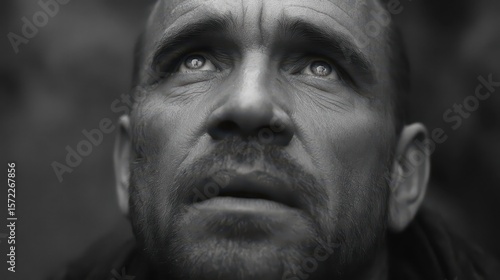 © Ariestia, Obraz premium Close-up grayscale portrait of a contemplative man.