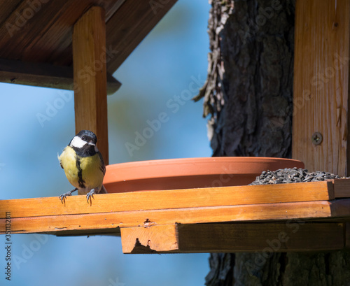 © Kristyna, Naklejka premium Close up Great tit, Parus major bird perched on the bird feeder table with sunflower seed. Bird feeding concept. Selective focus.