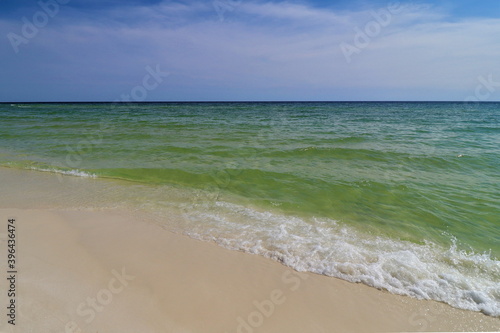 © Alex Kapov, Obraz premium Close-up green wave on the ocean shore, small wave creates foam, shooting from the beach