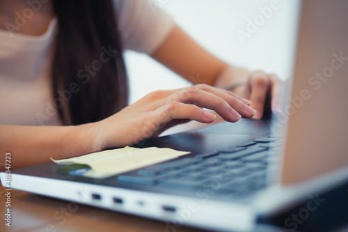 Fototapeta premium Close up hand of business people, student, adult typing text, email and searching information while sitting at home, workplace. Working on laptop computer concept.