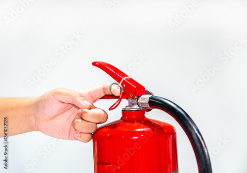Naklejka premium Close up hands pulling safety pin of fire extinguisher.