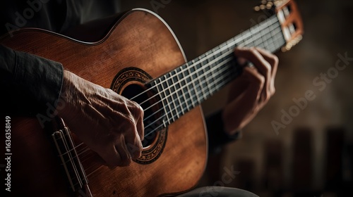 Fototapeta premium Close-Up Hands Strumming Classical Guitar – Warm Tones with Rustic Studio Background