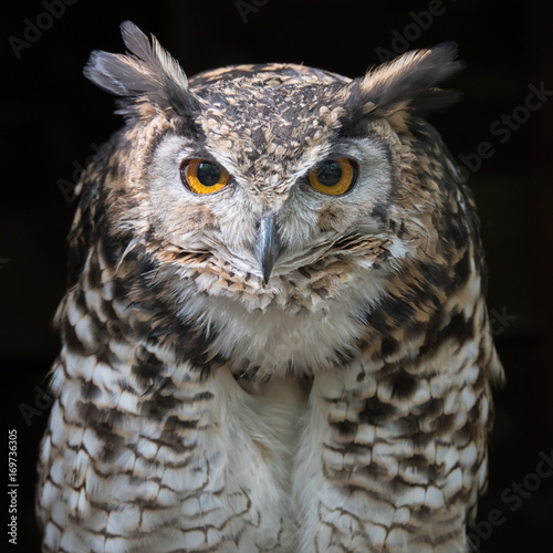 © alan1951, Fototapeta premium Close up head portrait of a mackinders eagle owl Bubo capensis mackinderi staring directly forward with a dark background square format