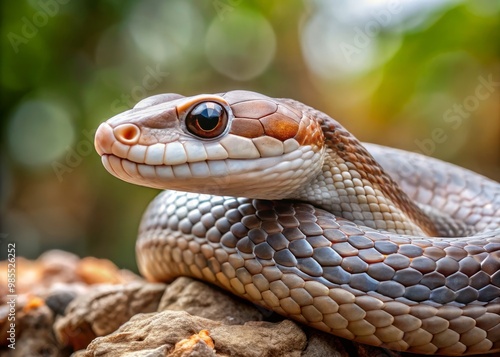 Fototapeta premium Close-up head shot of a copperhead gray rat snake on a rock with a blurred...