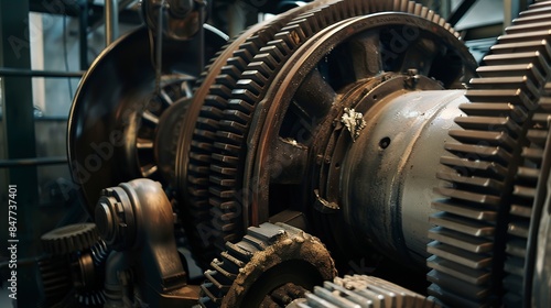 Fototapeta premium Close-up, heavy factory machinery gears, no humans, emphasis on safety...