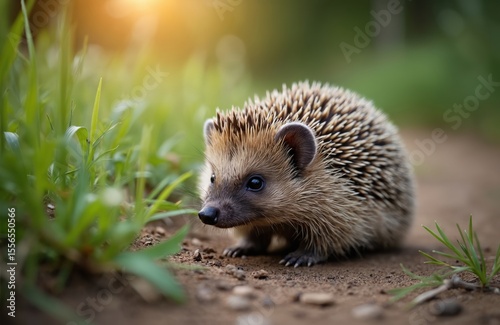 © Pete, Fototapeta premium Close-up hedgehog in garden. Small wild animal with sharp spines, brown fur. Cute hedgehog in natural environment, looking for food, forest background. Wildlife concept.