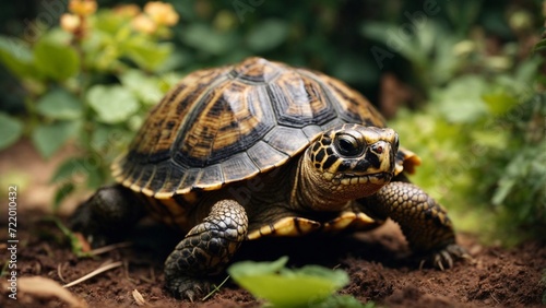 Obraz premium Close-up high-resolution image of a small tortoise in a tropical garden.