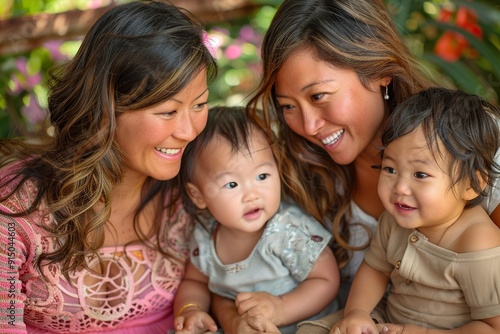 Fototapeta premium Close-up homosexual family, formed by two women, enjoying with their two babies.