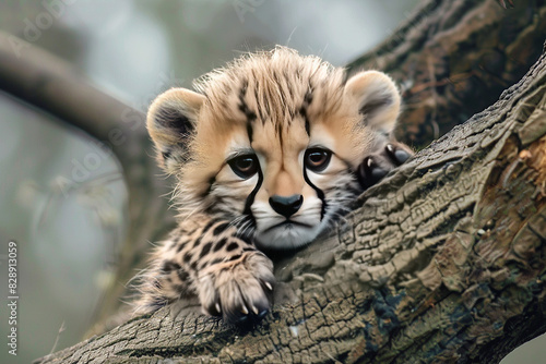 © AlfredoGiordano, Obraz premium close up horizontal image of a cute baby cheetah relaxing on a wooden branch