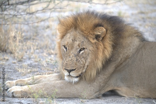 © Davide Antoniani, Naklejka premium Close-up horizontal image of a scarred male African lion lying on grey sandy ground in the Savuti area of Chobe National Park, Botswana. The lion is resting with his front paws stretched forward and h