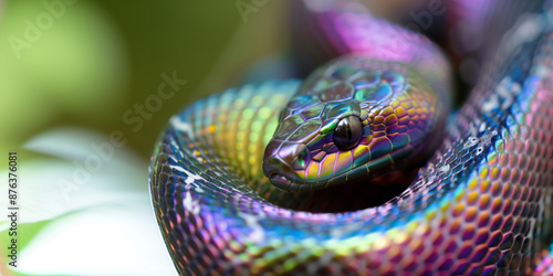 © Nadia Do, Fototapeta premium Close-up horizontal photo of a snake with beautiful iridescent neon skin pattern