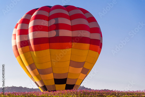 Obraz premium Close up hot air balloon flying up on cosmos field with blue sky background