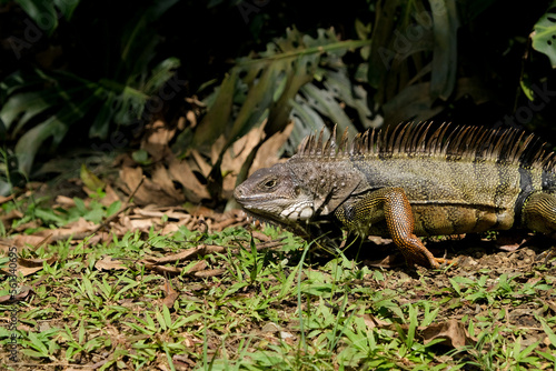 Obraz premium Close up iguana inside grass looking around. Selective focus.