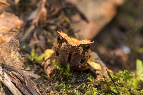 Naklejka premium close up image of a Borneo horned frog from Borneo on green leaves