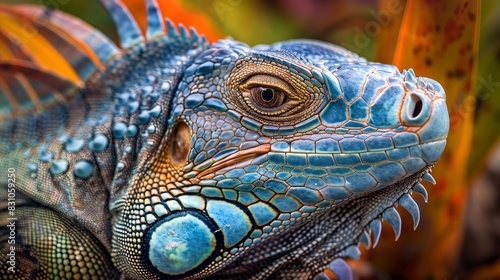 © GenBy, Fototapeta premium Close-up image of a colorful iguana showcasing vibrant scales and textures in a natural environment.