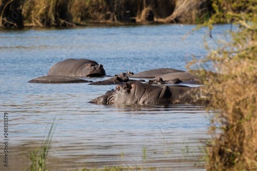 Fototapeta premium Close up image of a group of hippos in a lake in a national park in south africa