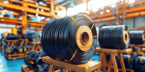 © Malee_Family, Obraz premium Close-up image of a single-mode black fiber optic cable on a large reel, illustrating fiber optic cable storage.