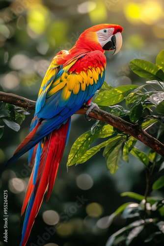 © Myroslava, Fototapeta premium Close-up image of an Ara parrot on a tropical tree branch in the rainforest