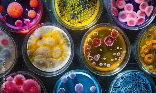 © wpw, Naklejka premium Close-Up Image of Diverse Bacterial Cultures in Petri Dishes