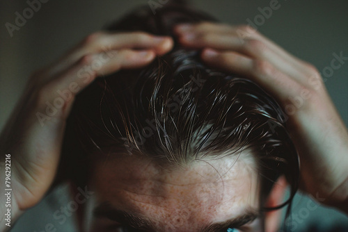 © Tetiana, Naklejka premium Close up image of hands touch hair created with generative ai concept