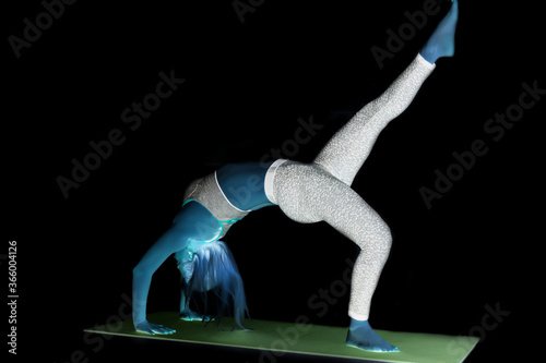 © Angelov, Fototapeta premium Close up image of middle eastern female in sports clothing relaxing after workout on grey background. Muscular female body with sweat. Image with copyspace for text