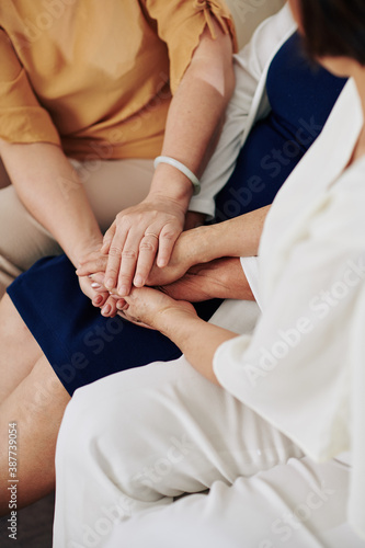 Fototapeta premium Close-up image of senior women touching hands of their friend to support her...