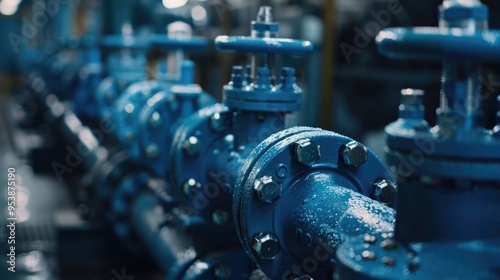 Fototapeta premium Close-up image of sturdy blue piping connectors in a factory setting, part of...