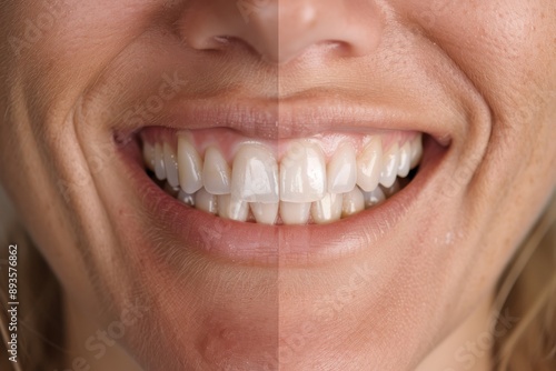 © Milos, Obraz premium Close-up image showing a comparison between natural and professionally whitened teeth, illustrating the effectiveness of dental treatments for a brighter smile.
