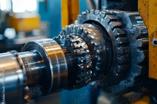 Obraz premium Close-up industrial machinery; metallic gears, shafts.