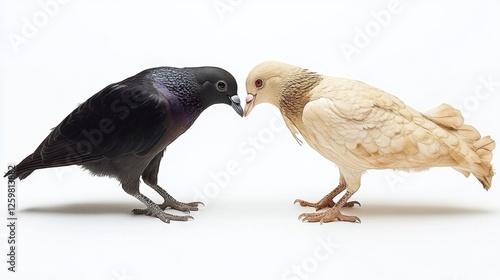 © Sam-th, Naklejka premium Close-Up Interaction Between A Black Bird And A White Pigeon Against A Plain Background