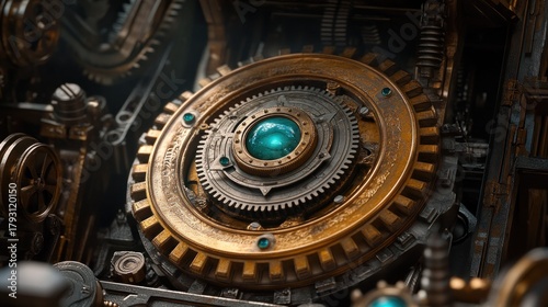 Fototapeta premium Close-up intricate gears, golden, teal jewel