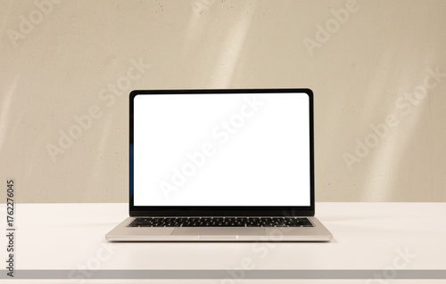 © chinnarach, Fototapeta premium close up isolated on blank screen display of laptop computer on table inside beige wall at office room for add content of design banner , website or template or online shopping e-commerce concept
