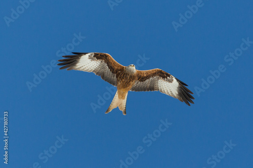 Obraz premium close-up isolated red kite (milvus milvus) flying in blue sky