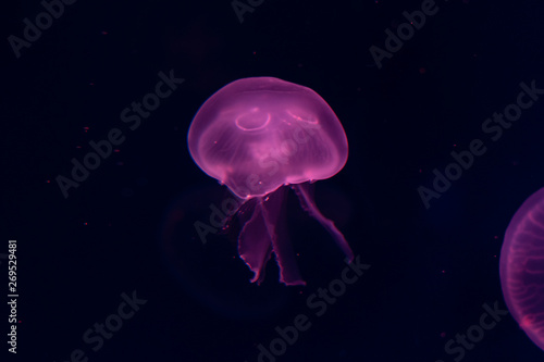 Fototapeta premium Close-up Jellyfish, Medusa in fish tank with neon light. Jellyfish is free-swimming marine coelenterate with a jellylike bell- or saucer-shaped body that is typically transparent.