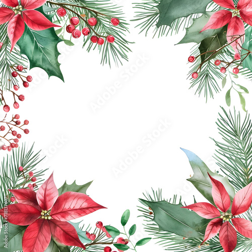 © Hasanul, Fototapeta premium Close-up landscape shot of an elegant Christmas floral frame with winter greenery border, hand-painted in watercolor, perfect for a festive holiday greeting card.
