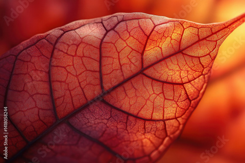 © Natalia, Obraz premium Close-up leaf with bright orange backdrop.