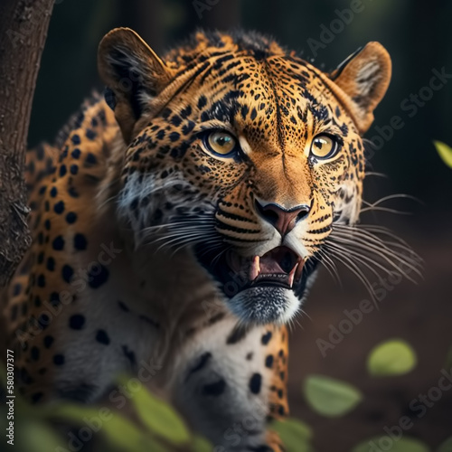 © Sergey Ilin, Obraz premium Close up leopard in forest. Generative AI