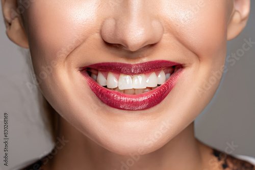 Fototapeta premium close up lips of woman, red lipstick, beautiful smile, woman with perfect teeth