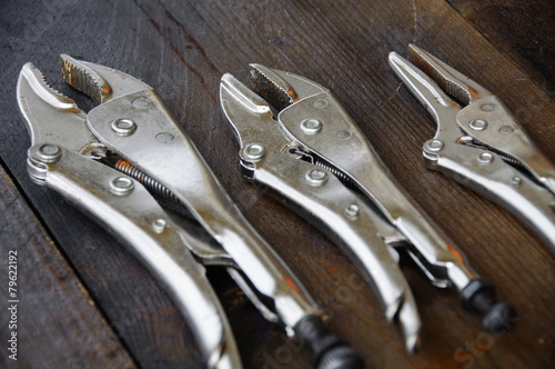 © currahee_shutter, Fototapeta premium close up locking pliers on wooden background