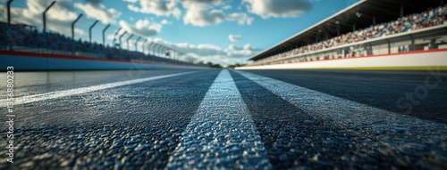 Obraz premium Close-up low angle perspective of racetrack with blue stripes and blurred...