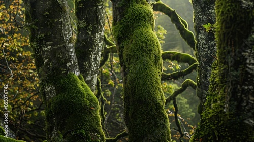 Fototapeta premium Close up lush green moss envelops the trees in the mystical woods of Torla in...