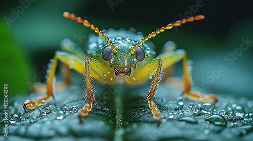 © scrollstudio, Fototapeta premium Close-up macro of a colorful beetle on a dewy leaf