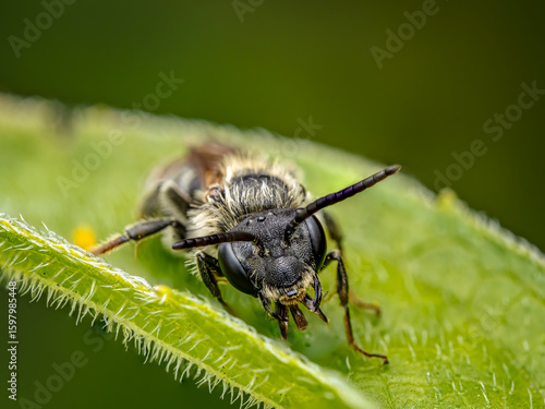 © Roman Milert, Fototapeta premium Close-Up Macro of a Small Bee on a Green Leaf Outdoors