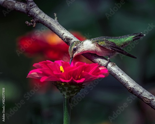 © Udean spinal, Fototapeta premium Close-up macro of a small wild hummingbird flying and feeding on a green flower in nature during spring