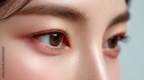 © Jane, Fototapeta premium Close-up macro of a woman's beautiful blue eye with long eyelashes, defined eyebrow, and intricate iris