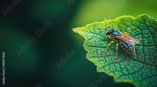 © FACTORY GRAPHICA , Naklejka premium close-up macro of wasp on green leaf