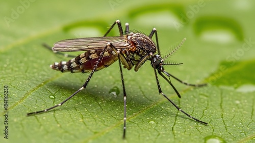 © lenase, Fototapeta premium Close-up macro photograph of a mosquito resting on a green leaf with water droplets.