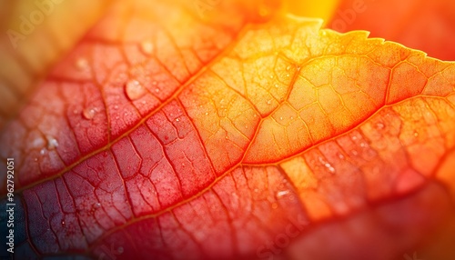 © studio, Fototapeta premium Close-Up Macro Photograph of a Red and Orange Leaf with Water Droplets